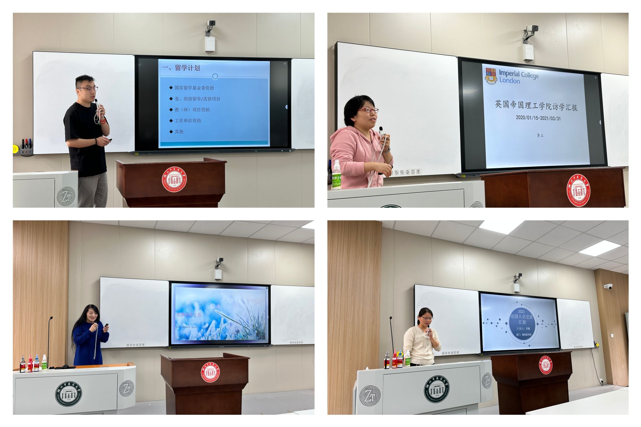 朱璧然老师主要从访学见闻、学习感想和后期工作计划三个部分汇报了自己的访学经历。徐云丹老师结合自身经历,描述了美国的风土人情与校园文化,着重介绍了她参与导师课题的经验和认识。李立老师分享了在英国帝国理工学院的学习情况、实验室的工作以及自己的感悟体会。黄敏老师介绍了西奈山伊坎医学院的基本情况、在国外参与的科研项目、主要成果以及下一步的工作计划。