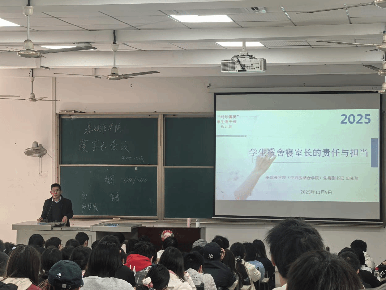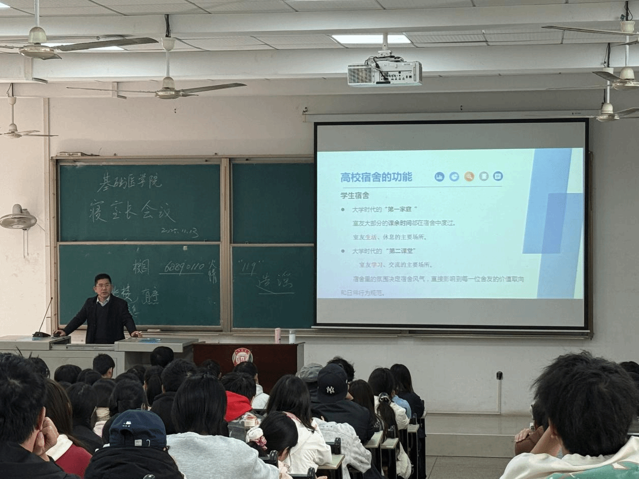 为进一步加强寝室长队伍建设,充分发挥寝室长在维护校园安全稳定工作中的作用。2025年11月13日中午,学院在基础楼J107教室召开寝室长专题培训会。学院党委副书记田先翔,辅导员王昶、黄炎垒和李相静,全体寝室长参加会议。