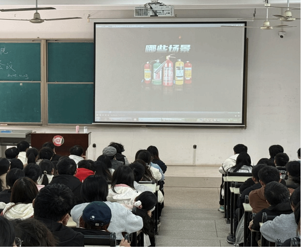 会议伊始,全体参会人员共同观看了消防知识科普视频。视频详细讲解了灭火器的种类、用途及正确使用方法,系统讲解了火情发生时的应急应对措施以及科学的逃生技巧,让在场的寝室长们对消防安全知识有了更直观、深入的了解。