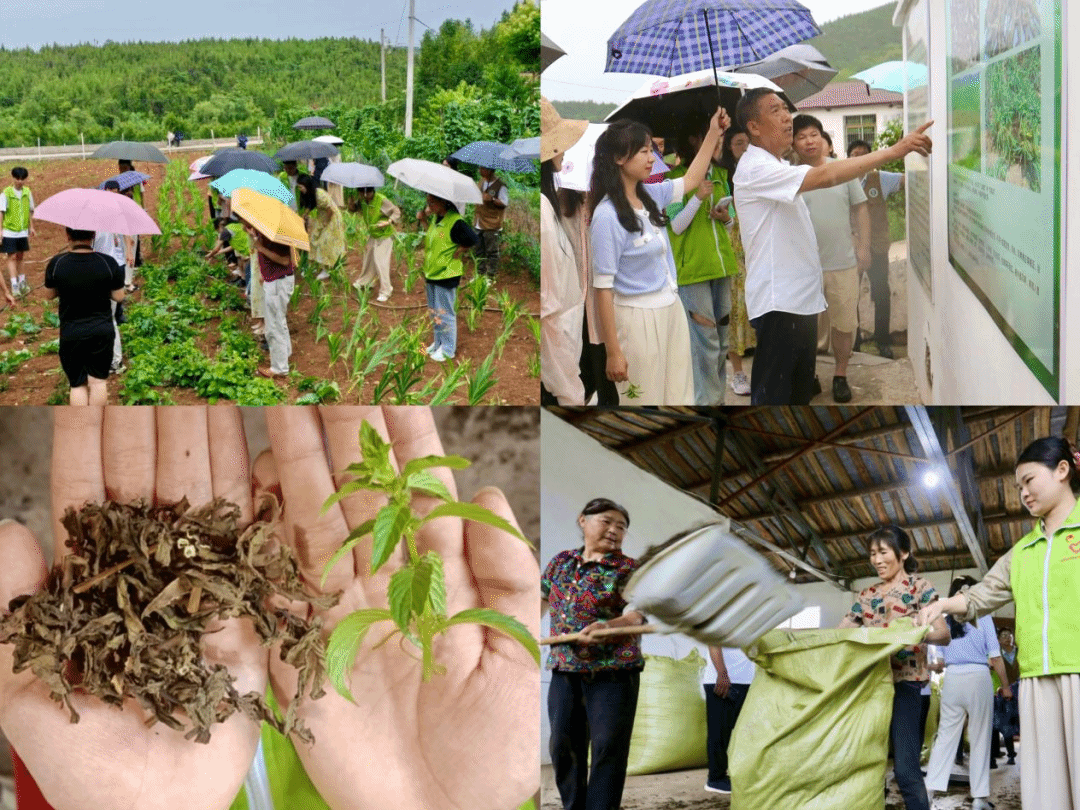 7月6日下午,实践团首先前往了丹江口市石鼓镇盘道村参观中药材种植基地、中药材合作社。师生们冒着大雨深入田间地头,实地辨认新鲜药材,了解其种植条件。在随后的交流座谈中,盘道村党支部书记杨本雷向实践团讲述了该村通过党建引领,党员干部带头,带领全村群众发展柴胡、苍术、黄姜等近10个品种的中药材种植产业,从远近闻名的“贫困村”一跃成为丹江口中药材种植“第一村”的事迹。学院相关负责人表示,将借助学院、学校专业特色优势,依托学院、学校大学生创新创业平台,在中药材的种植、加工及销售方面予以技术支持和合作,积极探索中药材产业助力乡村振兴的校地合作新模式。座谈结束后,学生党员代表何祥兴表示“听了杨书记的事迹我深受鼓舞,作为一名学生党员,我们也要肩负起时代赋予我们的使命,将自身专业知识用于实践,为家乡建设、为国家复兴贡献自己的力量!”