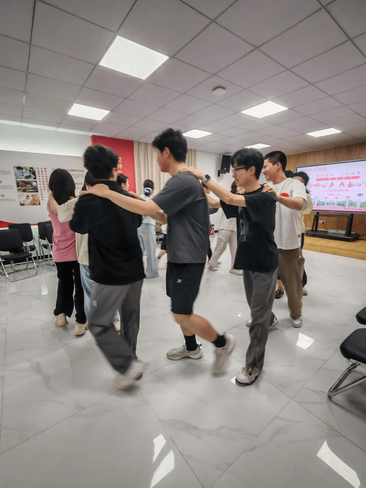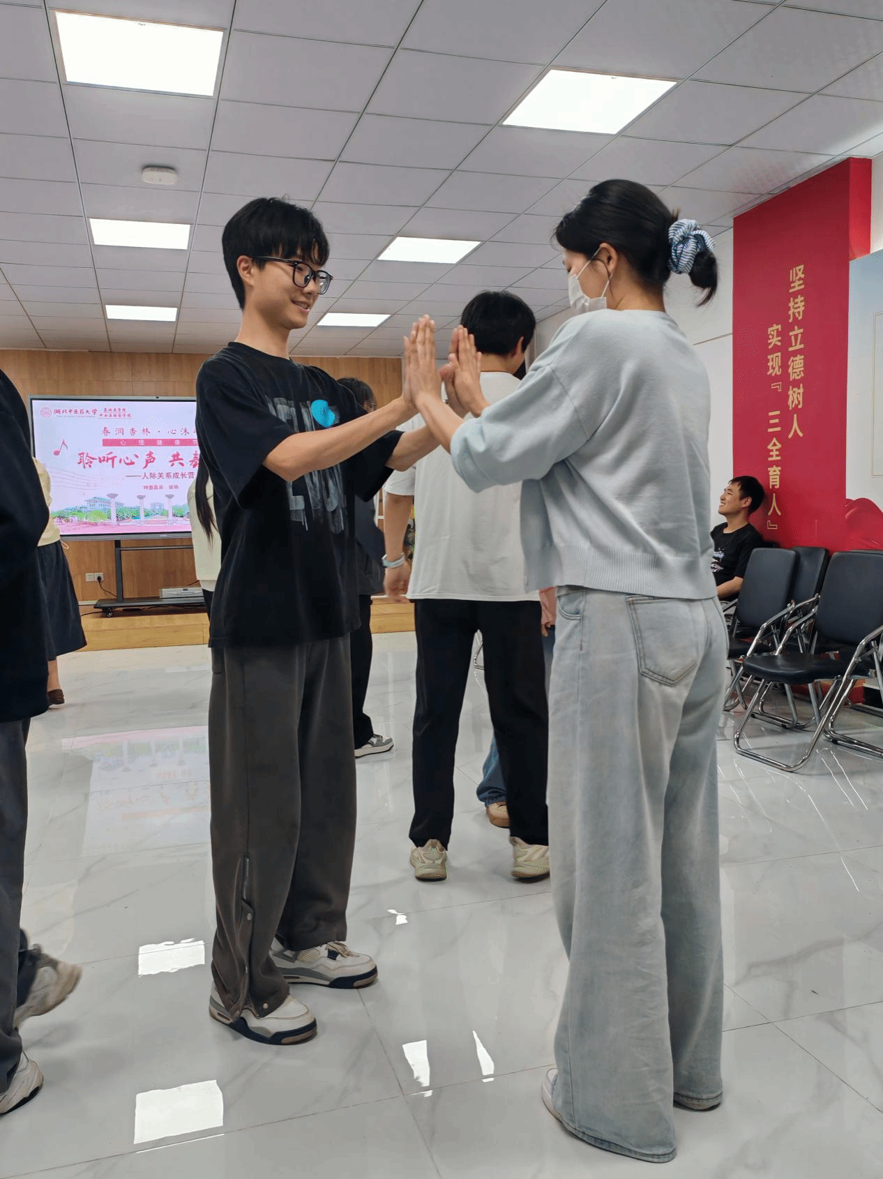 活动过程中,侯艳老师巧妙运用音乐这一独特的语言,开启了同学们的心灵探索之旅。跟随富有节凑的律动,同学们在音乐中摇摆起舞,瞬间拉进彼此之间的距离。